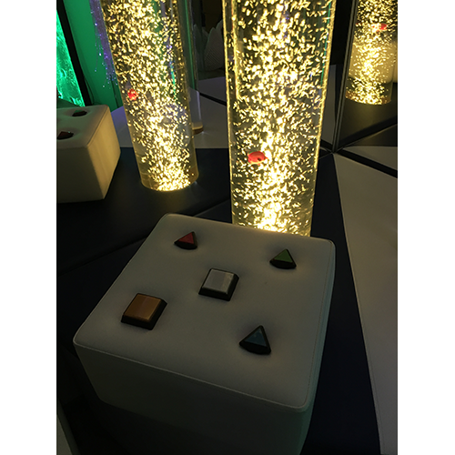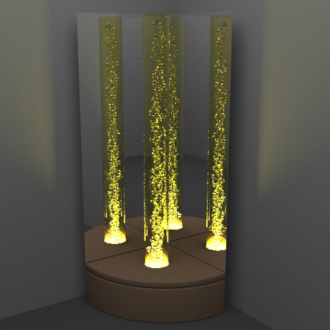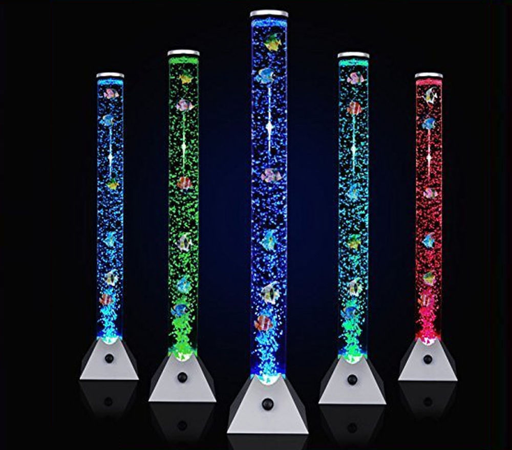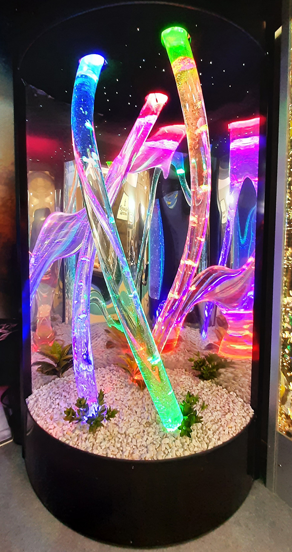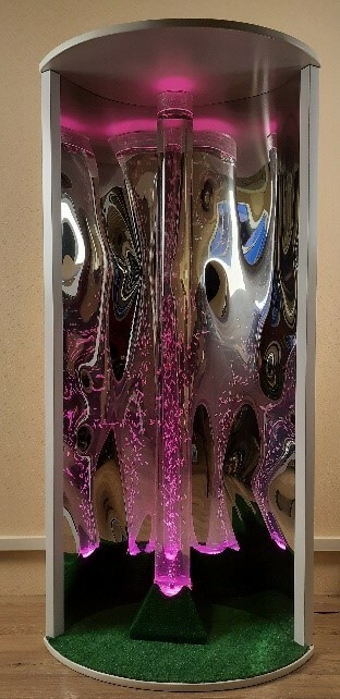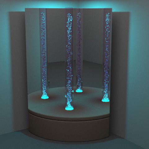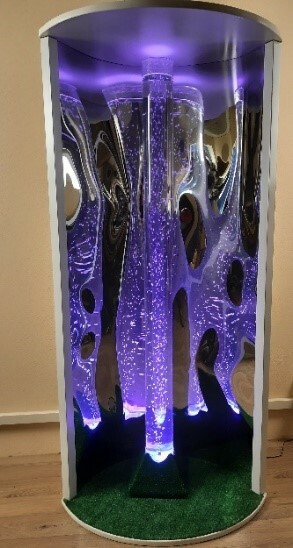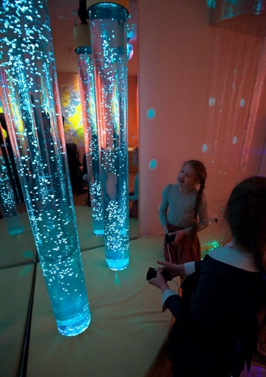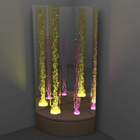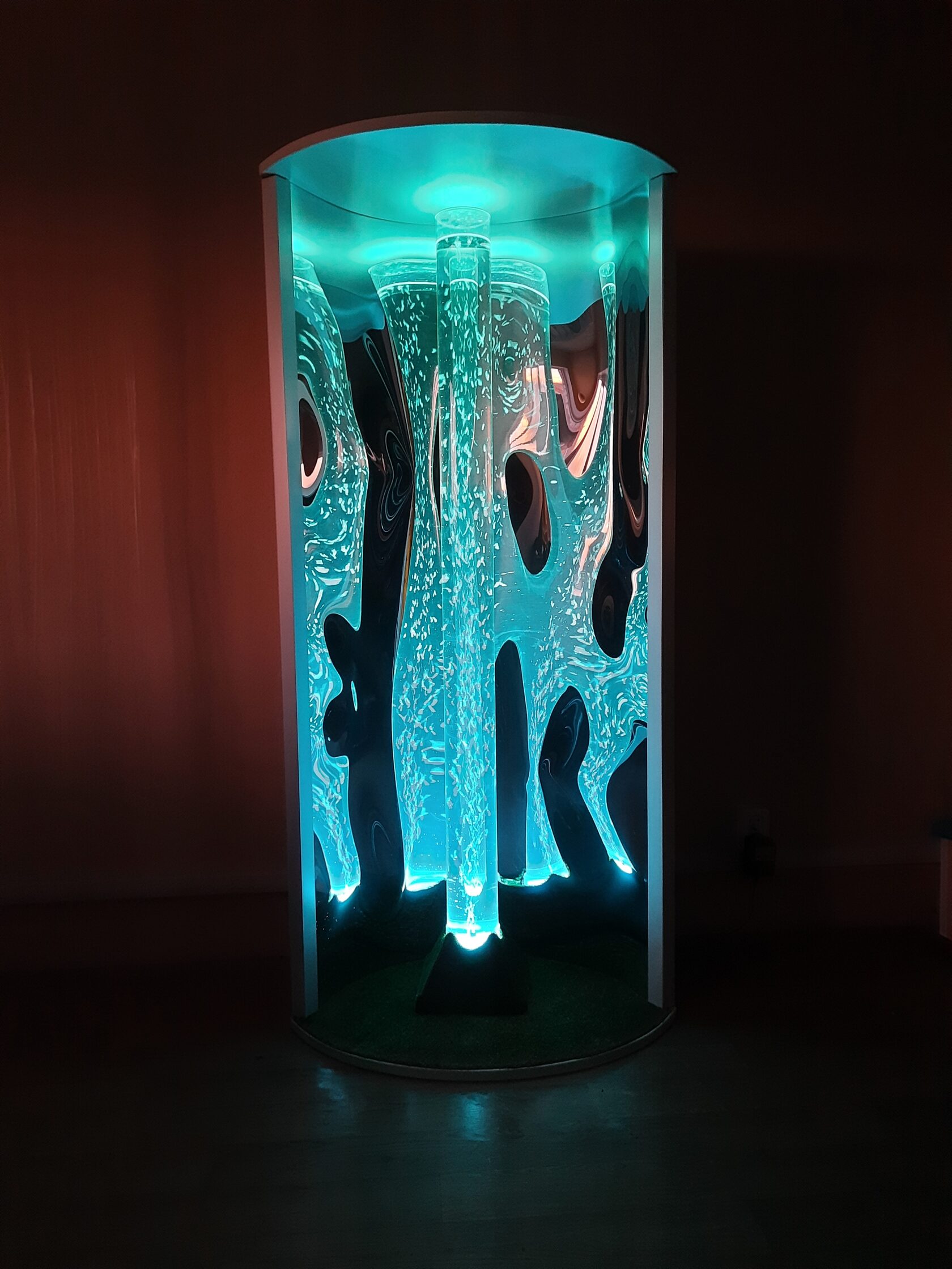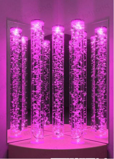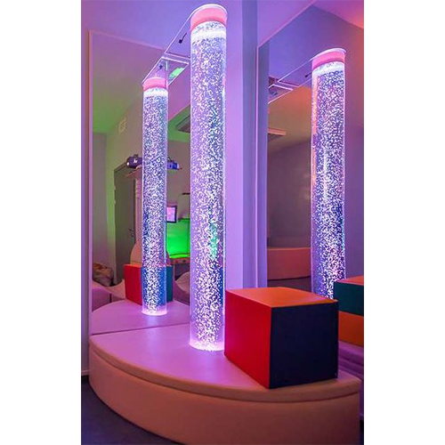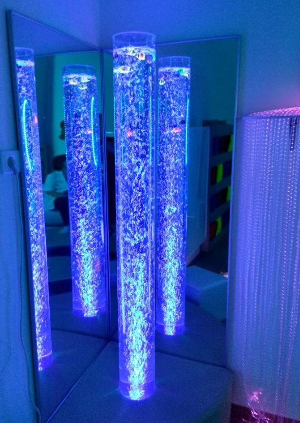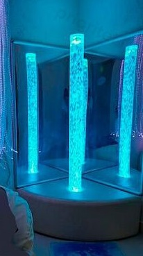 Пузырьковая колонна один из самых важных элементов в Сенсорной комнате. Колонны используются как в комплекте с мягким основанием (сидением) и акриловыми зеркалами, так и по отдельности. Колонна изготовлена из оргстекла. В комплекте имеет набор с декоративными рыбками и компрессор для подачи воздуха и образования поднимающихся внутри колбы пузырьков. Светодиодная подсветка, встроенная в нижнее основание. Управление: с помощью дистанционного пульта, который позволяет выбирать цвета, оттенки, регулировать яркость, задавать анимационные и световые эффекты.