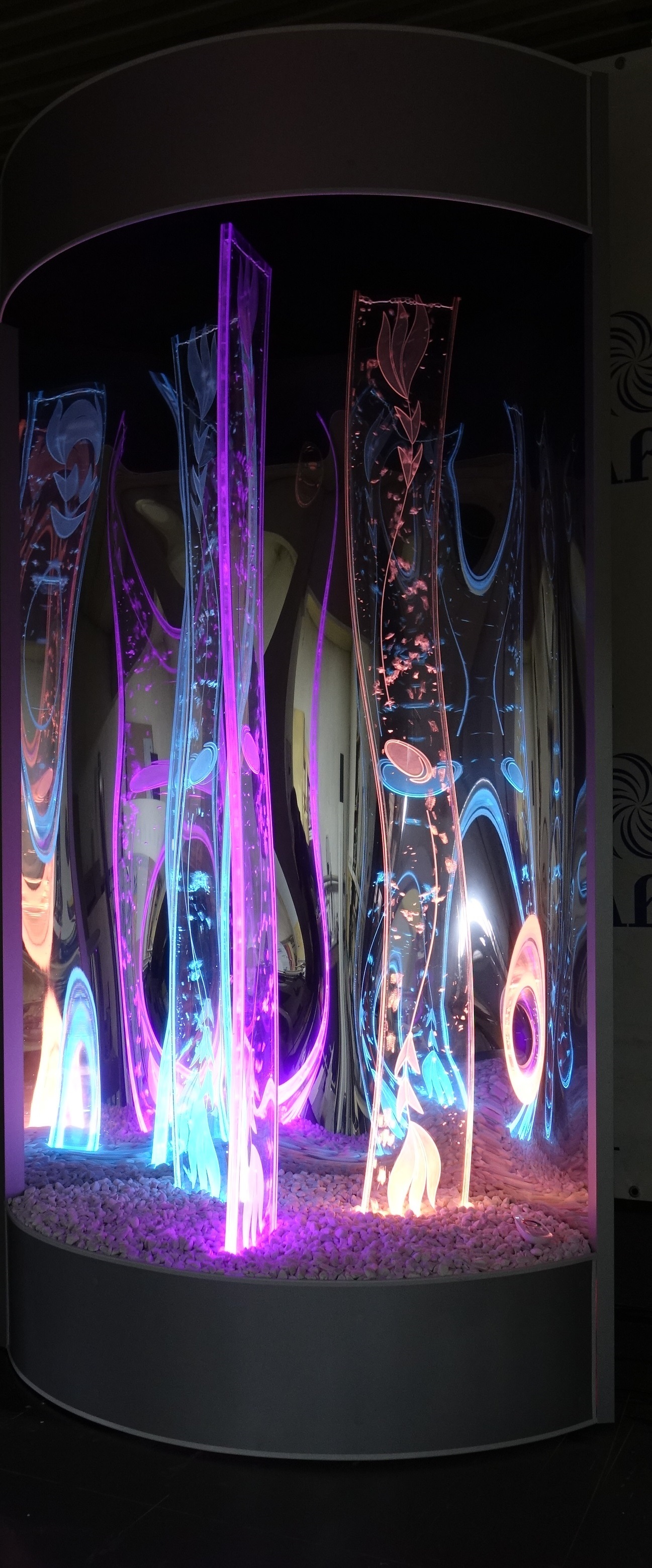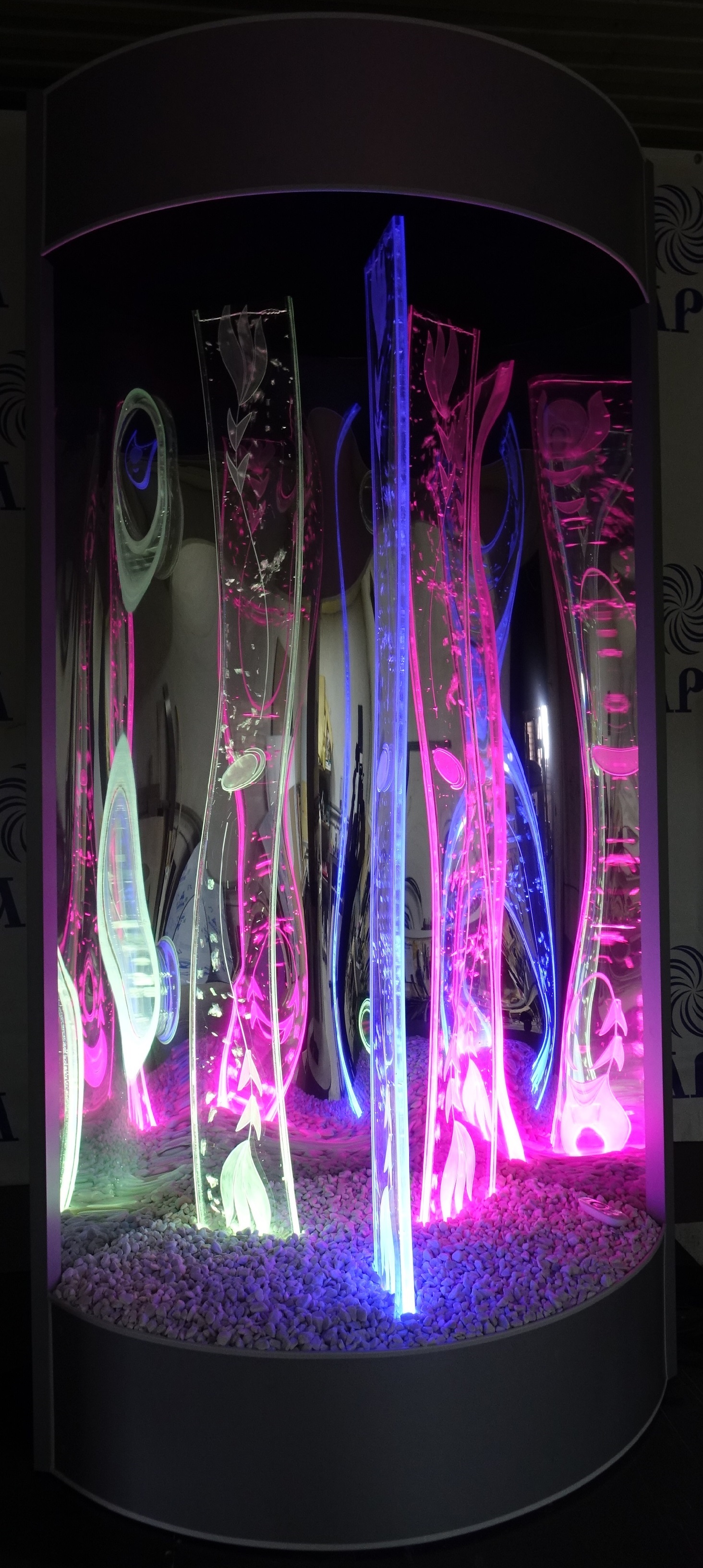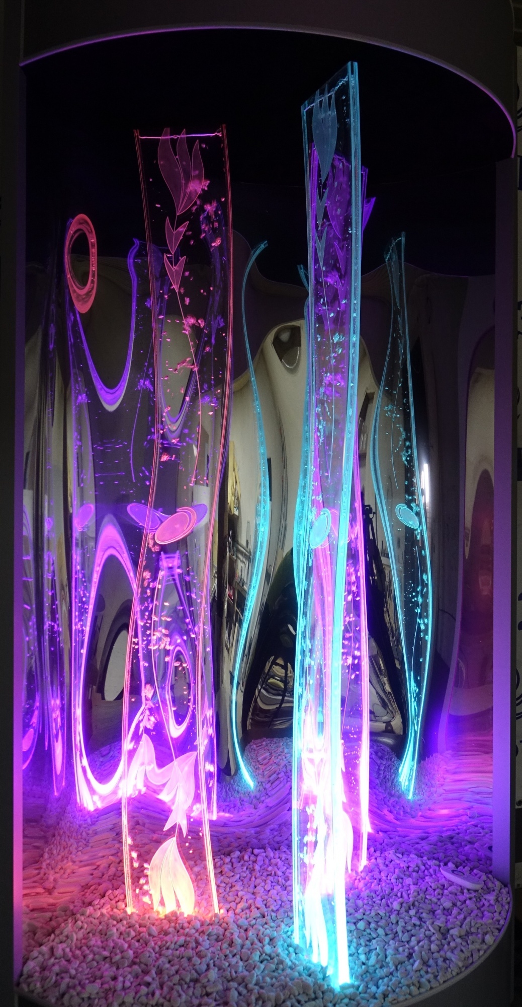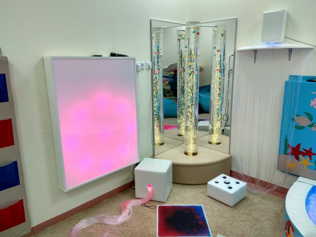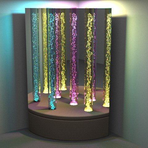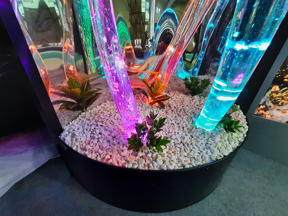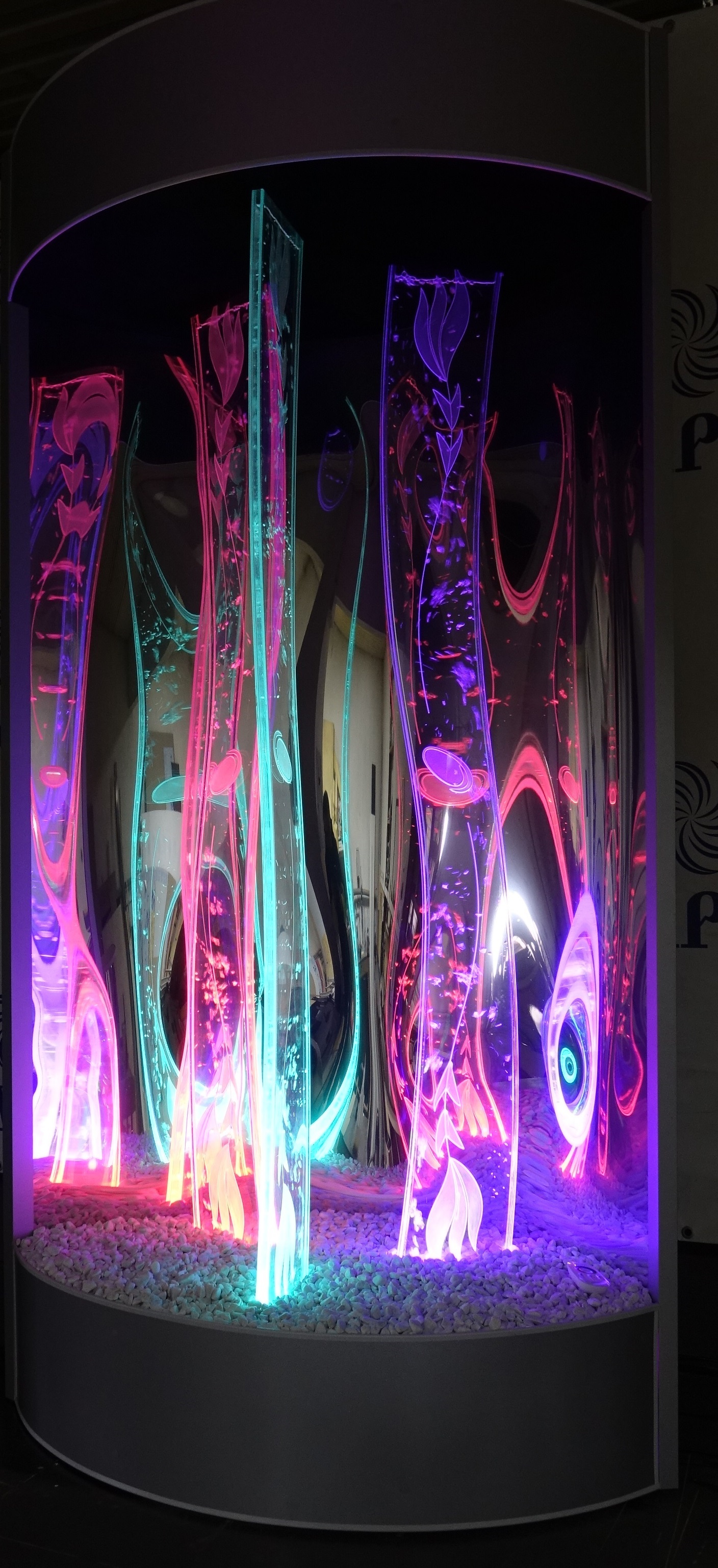 Пузырьковая колонна один из самых важных элементов в Сенсорной комнате. Колонны используются как в комплекте с мягким основанием (сидением) и акриловыми зеркалами, так и по отдельности. Колонна изготовлена из оргстекла. В комплекте имеет набор с декоративными рыбками и компрессор для подачи воздуха и образования поднимающихся внутри колбы пузырьков. Светодиодная подсветка, встроенная в нижнее основание. Управление: с помощью дистанционного пульта, который позволяет выбирать цвета, оттенки, регулировать яркость, задавать анимационные и световые эффекты.